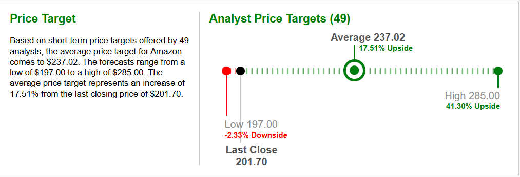 Akcie Amazonu připsaly na své hodnotě od začátku roku přes 42 % ke své hodnotě. Tento fakt zaujal nadnárodní investiční korporace, ale také soukromé investory pro nákup akcií (Nasdaq:AMZN), u které se očekává poslední čtvrtletí tohoto roku stejně, nebo více úspěšná díky stále se rozvíjející umělé inteligence AI u Amazonu. Analytici ze společnosti ZACKS.COM zvýšily své cenové cíle pro akcie Amazon Inc. (Nasdaq:AMZN). Průměrná cílová cena byla stanovena pro krátkodobý, až střednědobý investiční horizont na 237,02 USD za akcii.