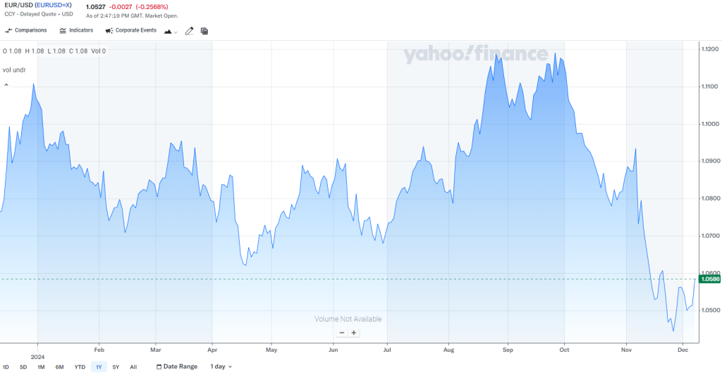 • Rozdíly v měnové politice: Zatímco Federální rezervní systém (Fed) v USA pokračuje v politice vysokých úrokových sazeb, ECB signalizuje opatrný přístup k dalšímu zvyšování sazeb. To limituje posilování eura​.