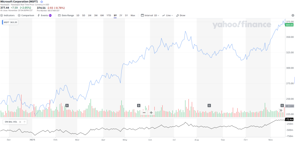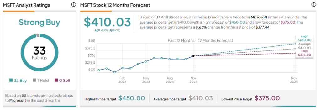 Společnost také vyplácí svým akcionářům pravidelné kvartálních dividendy. Aktuálně je dividendový výnos 0,86 % p.a.. Vlastní výše dividendy byla schválená valnou hromadou na částku 0,75 USD na akcii. Společnost má aktuálně také známý termín pro využití výplaty dividendy akcií (NASDAQ-MSFT), tak zvaný Ex-Dividend-Date), který byl stanovený na 15. listopadu 2023. Samotný den pro výplatu dividendy (Pay-Date) společnost stanovila na 25. ledna 2024. Podle analytiků makléřských společností a finančních stratégů investičních bank lze očekávat v krátkodobém, až střednědobém investičním horizontu růst ceny akcie. Průměrná cílová cena pro krátkodobý, až střednědobý investiční horizont byla stanovena na 410,03 USD za akcii.