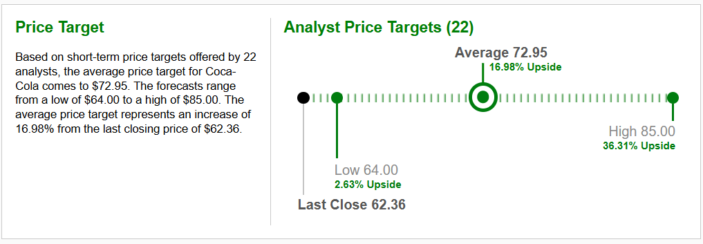 Společnost Coca-Cola také vyplácí pravidelné kvartální dividendy. Aktuální výše dividendy činí 0,485 USD na akcii. Výše vlastní dividendy je 1,94 USD na akcii. Při současné ceně akcie kolem 62,83 USD to odpovídá dividendovému výnosu přibližně 3,09 %. Průměrná cílová cena pro krátkodobý, až střednědobý investiční horizont akcie společnosti Coca-Cola (NYSE: KO) byla stanovena analytiky společnosti Zacks.com na 72,95 USD za akcii.