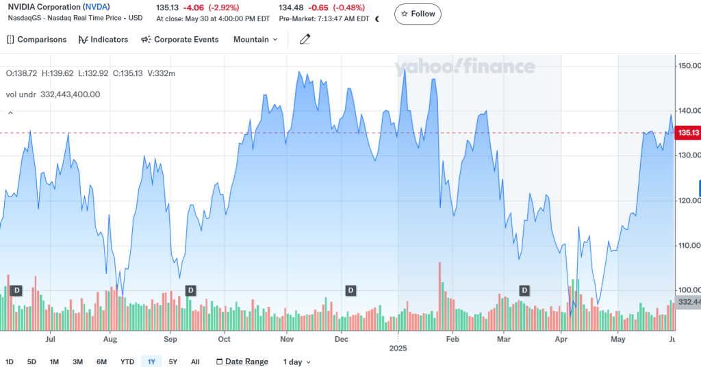 K datu 2. června 2025 se akcie společnosti Nvidia obchodují za přibližně 135,13 USD, přičemž tento kurz odráží více než 1 000% meziroční růst. Aktuální cenová úroveň představuje výrazné posílení tržní kapitalizace a potvrzuje důvěru investorů v dlouhodobý růstový potenciál společnosti v oblasti AI, výpočetní infrastruktury a grafických technologií.