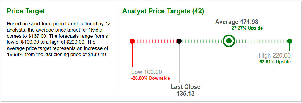 Společnost NVIDIA Corporation (NASDAQ:NVDA) také vyplácí pravidelné kvartální dividendy. Aktuálně je dividendový výnos 0,03 % p.a. Vlastní výše dividendy byla schválené valnou hromadou společnosti na 0,01 USD na akcii. Průměrná cílová cena pro kratkodobý, až střednědobý investiční horizont stanovila 42 analytiků ze společnosti Zacks.com na 171,98 USD za akcii.