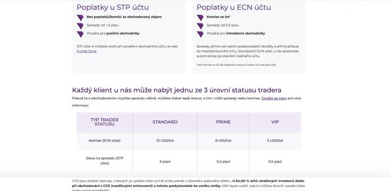 Konkurenční spready: Purple Trading klade důraz na nízké spready napříč různými nástroji. Nabízí jak fixní, tak variabilní spready, což potenciálně snižuje náklady na obchodování, zejména pro obchodníky s velkým objemem obchodů.