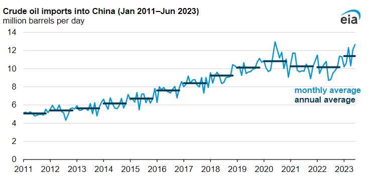 Během první poloviny roku 2023 byly do Číny dovezeny rekordní objemy ropy kvůli expanzi rafinérií a znovuotevření ekonomiky poté, co vláda uvolnila omezení mobility po mpandémii COVID-19 . Čína dovezla v první polovině roku 2023 v průměru denně 11,4 milionu barelů, což je 12% nárůst oproti ročnímu průměru (v roce 2022 to bylo 10,2 milionu barelů).