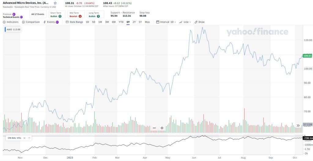 CPU datového centra AMD se používají na serverech poskytovatele cloudových služeb (CSP). Společnost AMD má oproti konkurenčnímu Intelu výkonovou a cenovou výhodu, která společnosti AMD umožňuje i nadále získávat podíl na trhu. Společnost Advanced Micro Devices, Inc. (AMD:NASDAQ) také uvede na trh koncem tohoto roku nový čip MI300 grafického procesoru (GPU), aby mohl konkurovat dominantnímu lídrovi trhu NVIDIA tím, že tento čipset bude za atraktivnější cenu. AMD již spolupracuje s Microsoftem a Metou, zatímco Amazon prodává na svém e-shopu AMD čipy. Podle bankovních institucí a nadnárodních investičních korporací lze očekávat v krátkodobém, až střednědobém investičním horizontu růst ceny akci, kde byla průměrná cílová cena stanovena na 137,57 USD za akcii.