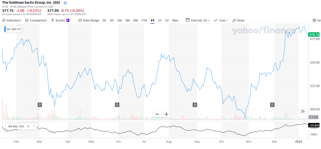 Společnost nedávno oznámila hospodářské výsledky za třetí čtvrtletí roku 2023. Společnost utržila celkový obrat v hodnotě 11,82 miliardy USD s čistým ziskem 2,06 miliardy USD. Předseda představenstva a generální ředitel společnosti Goldman Sachs David Solomon k tomuto čtvrtletí řekl: „Pokračujeme v dosahování významného pokroku při plnění našich strategických priorit a jsme přesvědčeni, že práce, kterou nyní děláme, nám poskytuje mnohem silnější platformu pro rok 2024. Pokračující oživení, jak na kapitálových trzích, tak ve strategické činnosti, pokud podmínky zůstanou příznivé. Jakožto lídr v oblasti poradenství v oblasti fúzí a akvizic a upisování akcií bude oživení aktivity pro Goldman Sachs a nebude nepochybně brzdou.“ Společnost Goldman Sachs Group, Inc. (NYSE-GS) také vyplácí svým akcionářům pravidelné kvartální dividendy. Dividendový výnos je aktuálně 2,91% p.a. a vlastní výše dividendy byla schválená valnou hromadou společnosti na hodnotu 2,75 USD na akcii. Podle analytiků makléřských společností a finančních stratégů investičních bank lze očekávat v krátkodobém až střednědobém investičním horizontu růst ceny akcie, kde byla průměrná cílová cena akcie stanovena na hodnotu 404,56 USD za akcii.
